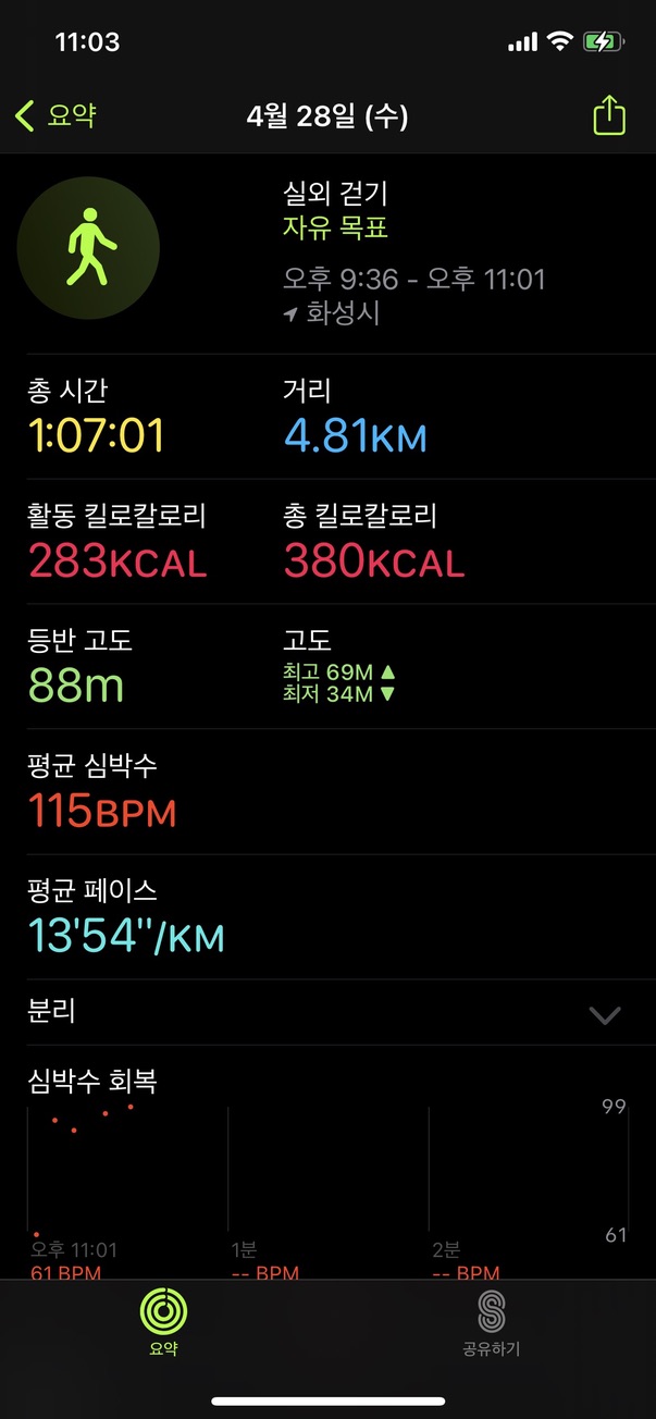 나는 토요일날 항상 약속이있다.매 주 고정적으로 있는것이라 그 때에는 아침저녁을 제외한 루틴은 수행하지않기로 했다.(그래서 아직 제대로 나머지루틴들을 수행해본적이 없다..ㅎㅎ) 자 어쨌거나, 그런 토요일이라도 아침 저녁은 제대로 한 것 같다구!아웃도어워킹을 항상 해주고있다.한시간을 설정해놓고 도는데, 5키로를 넘는적이 없는것같다.여유있게하면 항상 4.7~8키로오늘같은날은 제대로 간격유지하면서 씩!씩!하게 걸어줬는데 4.92키로가 나왔다. 사실 4.8쯤이였으나, 몇분남았을때 뛰었다. 5키로 채워보고싶어서. [결론]그러니까.. 결국에는 오늘같이 씩!씩!하게 걸어줬던것보다 더 하이템포로 걸어줘야하는것 같다.거의 경보수준일것같은데, 조만간 한번 도전해봐야겠다. 그럼 총 두가지의 할일이 생긴것이다.1.시속 5키로..