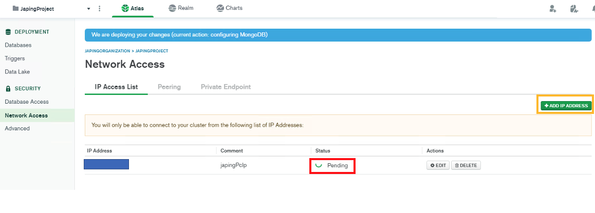 2. 주황색 박스안에있는 Add IP Access버튼을 클릭하여 본인의 현재 IP주소를 입력한다.
