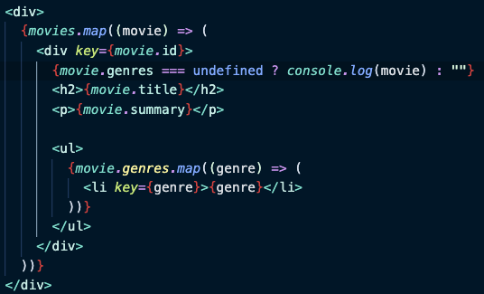 2.따라서 genres키가 없는 Movie객체에 접근했을때에는 undefined.map(~)이 되는것이므로 에러가 뜨는 것!