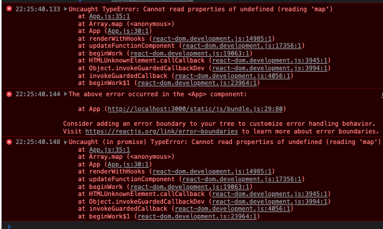 여느때처럼 React복습을 하고있는 나.오늘도 어떤 반가운 오류를 조우하게되었다Uncaught TypeError: Cannot read properties of undefined (reading 'map')The above error occurred in the component:Uncaught TypeError: Cannot read properties of undefined (reading 'map') ==> 대충 undefined에 map을 사용하고있다라는 뜻 !!!코드는 아래와같다.(정확히는 {movie.genres.map(... 부분} {movies.map((movie) => ( {movie.title} ..